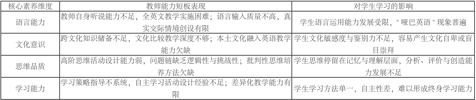 表 1:农村初中英语教师核心素养教学能力短板分析