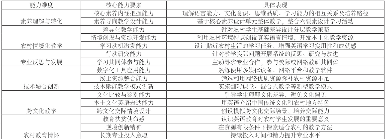 明确农村初中英语教师应具备的教学能力结构是设计提升路径的基础。在核心素养导向下,传统的以语言知识传授为中心的教学能力观已无法满足当代英语教育的要求,需要建立更加全面、系统的教学能力框架。具体见表2.