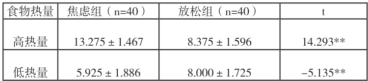 将 80 名被试随机分为焦虑组和放松组,并两组的进食选择进行计分并做独立样本t 检验,结果如下: