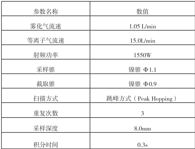 该方法验证使用具备耐氢氟酸进样系统的电感耦合等离子体质谱仪(Agilent 8900)。其射频发生器功率、雾化气流速、稀释气流速等测量参数见表1。