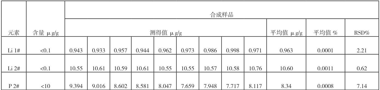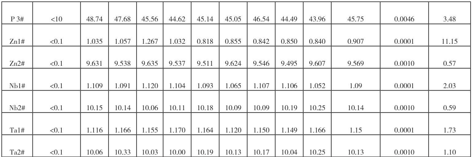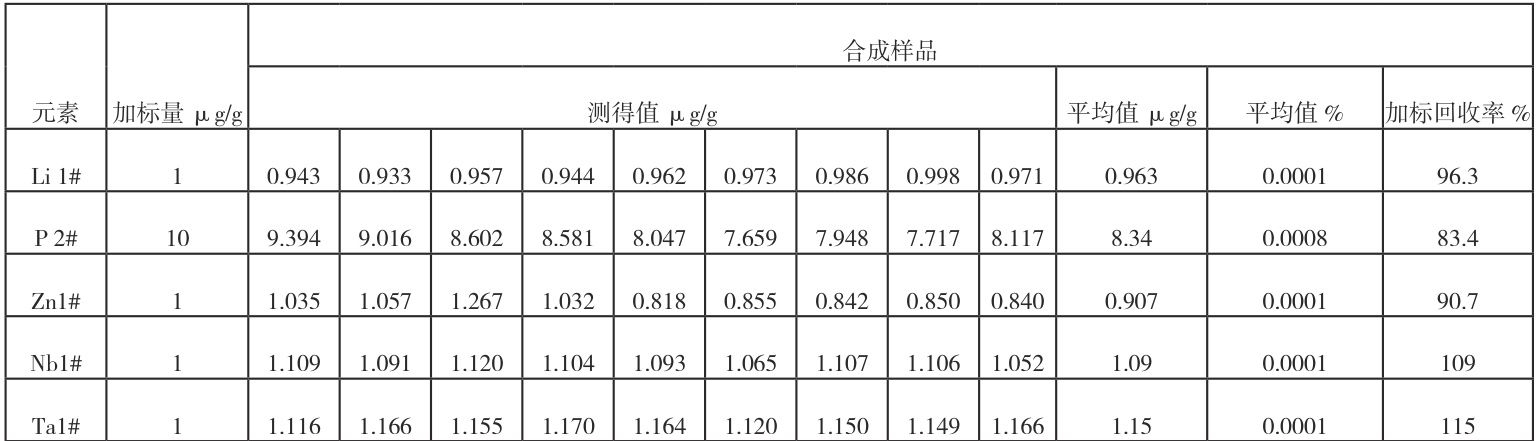 由于所收集到的纯锆中锂、磷、锌、铌和钽含量很低,故试验通过加标合成样品进行精密度试验。依次加入 0.01mL, 0.10mL 、 0.50mL 、1.00mL 标准溶液(3.1.3),进行加标回收试验,即在称完样品后直接在相应容量瓶中加入适量的标准溶液,加酸溶解样品,合成样品 1#、2#、3#。在仪器最佳条件下独立测定 9 次,取平均值,结果见表4。