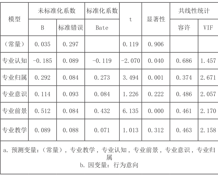 ,表现为不显著。具体分析显示,专业认知的标准化系数为-0.119,对行为意向无正向影响;而专业前景、专业归属的标准化系数为正,对行为意向有正向影响。综上,假设H1、H3、H5 不成立,H2、H4 成立。