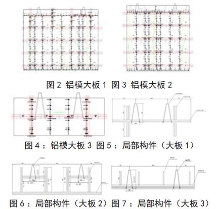 2.1.1 构件组成(由各部件组装成三块铝模大模板,背楞 + 方通 + 钢筋 + 螺母 + 铝模 + 钢筋等构件组成铝模大板,图2\~ 图7):