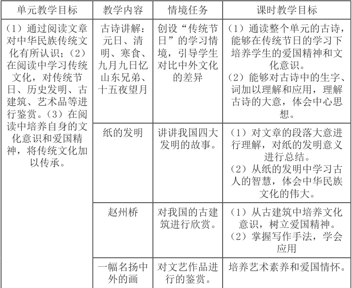 大单元统领下的主题阅读开展最重要的是要明确主题,主题的选择是开展好群文阅读的关键,所以在开展大单元教学时,教师要对教材进行整合和分析,从中确定主题,并将与主题相关的文章凝聚在一起,以大概念、大主题的形式开展。所以主题的确定在大单元教学的第一步[2],在本文中笔者已经确定了主题,是以传统文化作为参考对教材内容进行搜集和整合的,所以在开展这一主题时,笔者就省去了很多精力,但是在教材的整合和研读过程中依然花费了不少心血。