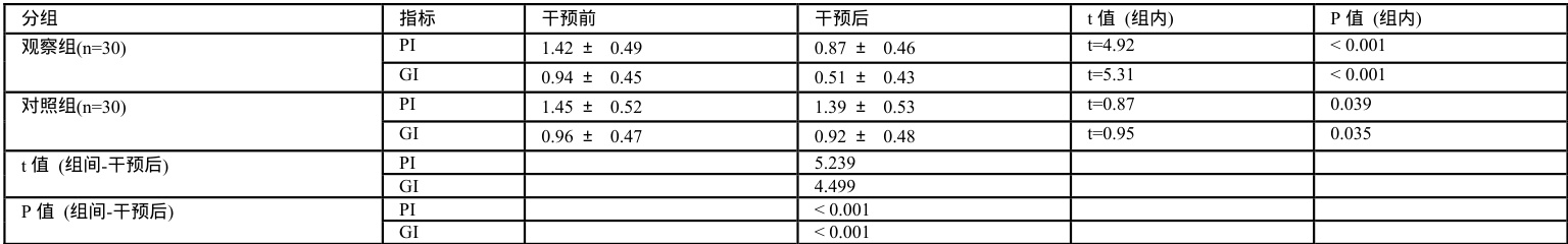 干预后,两组患儿的牙菌斑指数PI、牙龈指数GI 评分显著低于干预前( P<0.05 ),差异具有统计学意义,干预后观察组患儿PI、GI 分数显著低于对照组( P<0.05 ),差异具有统计学意义。具体数据见表 2