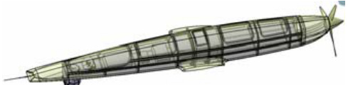 该无人机平台设计巡航飞行速度为 200km/⋅ 小时,属于低速飞机,基于翼展尺寸约束,选用自然层流翼型。机身采用非圆截面,机头部分向下收于底部平面,减小了机身阻力。机体材料主要选择碳纤维环氧树脂基复合材料、玻璃纤维环氧树脂基复合材料、航空铝合金。