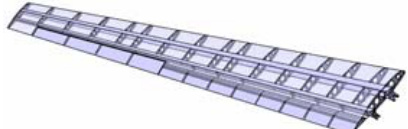 如图 6 所示,机翼结构由 2 根梁、若干翼肋、上下蒙皮等组成,均为复合材料结构。与机身主承力框通过对接接头使用螺栓连接,对接接头为高强度铝合金结构。