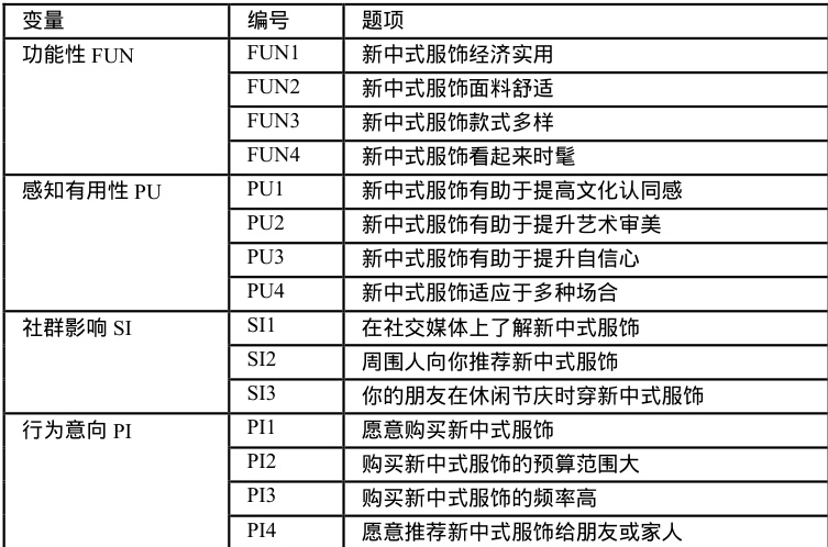 本文构建的青年群体对新中式服饰接受意愿情况的影响因素模型包括功能性(FUN)、感知有用性(PU)、社群影响(SI)和行为意向(PI)。以下是每个变量的问题设置。