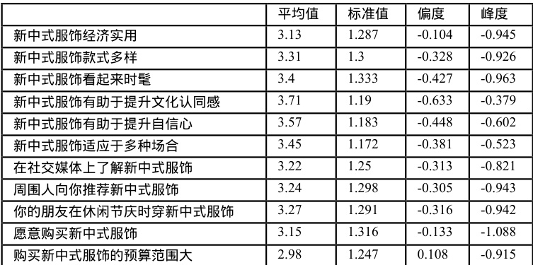 对各因素进行描述性统计,结果如表 2 所示。量表设置的分值是从 1 到 5 分,从表 2 可知,各个因素的平均值普遍高于中间值 3 分,其中大多数人认为新中式服饰有助于提高文化认同感,可以看出人们接受新中式服饰的意愿较为强烈。