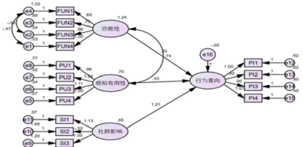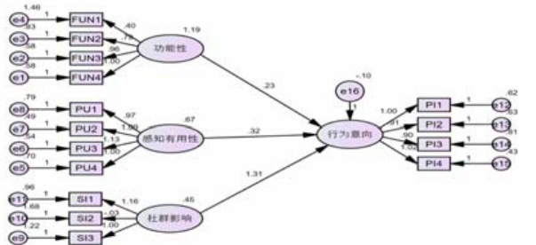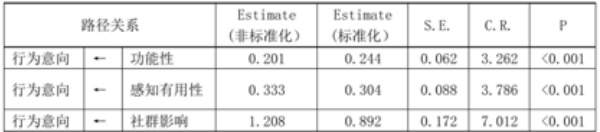 由表 3 可知,“ 功能性 $$ 行为意向” 、感知有用性 $$ 行为意向” 和“ 社群影响 $$ 行为意向” 的 P 值均小于 0.001,说明三条路径都是显著的。因此,H1、H2 和 H3 的假设成立。模型评估结果如图 3 所示。