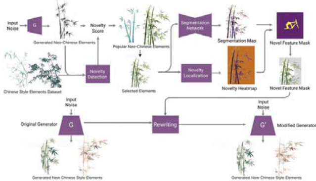 本研究提出了一种基于生成对抗网络(GAN)的技术,旨在从传统与现代元素的融合中提炼出独特的视觉风格,并生成创新的图案或设计元素。核心技术原理如下: