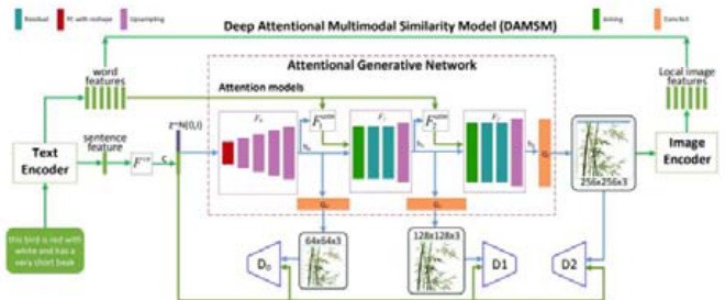(2)跨模态映射与优化:在GAN 的框架下,模型通过对抗性训练学习如何将文本信息映射到图像特征上。生成器网络生成图像,而判别器网络则评估生成图像与真实图像之间的差异。这一过程不断迭代,直至生成器网络能够产生与输入文本高度一致的图像。对抗性训练不仅提高了生成图像的视觉吸引力,而且确保了图像内容与输入文本在语义上的一致性。通过这种方式,模型能够学习复杂的跨模态映射,并生成在视觉上和内容上都与文本描述相符合的图像。