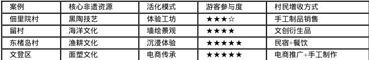 以非遗为核心资源,设计开发文旅产品,延伸产业链条,实现价值转化。规划主题化旅游线路设计,整合非遗体验点、文化景观、自然风光,设计特色鲜明的主题线路(如“ 胶东非遗研学游” 、“ 海草房古村落探访游” 、“ 渔耕文化体验游” ),满足不同游客需求;策划体验式旅游活动,开发深度参与的非遗体验项目(如佃里院村黑陶制作、东楮岛村渔家乐、传统手工艺 DIY),策划举办结合农时、节庆的文化主题活动(如樱桃采摘节、非遗文创市集),增强吸引力与粘性;加强本地化特色产品开发与营销,对乡土特产(农产品、海产品、手工艺品)进行文化包装和品牌打造,利用旅游活动、线上平台等进行销售,提升附加值,直接促进村民增收(如文创集市对乡土特产的售卖)。