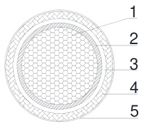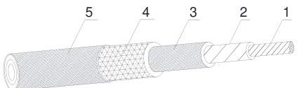 图 1 中:镍铬丝导体 1;高硅玻纤绕包带 2;复合云母包带层 3;鱼丝编织管层 4;涂覆硅胶保护层 5;组成一种高耐温 600∘C 高耐温导线技术。