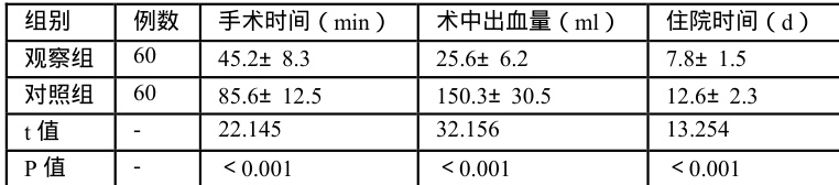 手术相关指标:记录两组患者的手术时间、术中出血量及住院时间。