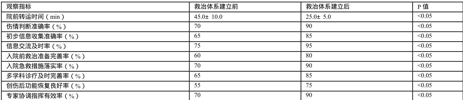 结果显示,救治体系建立后,各项观察指标均较建立前有显著改善( P<0.05 ),表明赣南地区危重创伤救治能力得到明显提升。