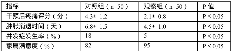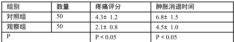 观察组疼痛评分干预后3 天降至( 2.1±0.8 )分,显著低于对照组的(4.3±1.2)分( ρP<0.05 );肿胀消退时间为( 4.5±1.0 )天,短于对照组的( 6.8± 1.5 )天( P<0.05 )。(见表1)