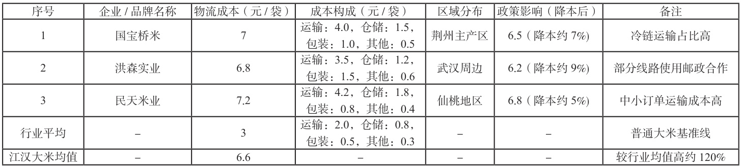 物流成本是制约江汉大米市场竞争力的关键因素之一。当前,普通大米产品的物流成本普遍约为3 元 / 袋,而江汉大米部分企业的物流成本却高达7 元/ 袋,显著高于行业平均水平。