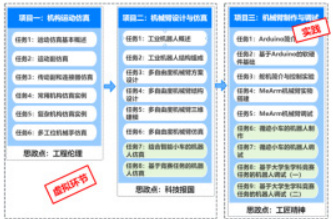 结合《创新设计与实践》课程目标和学生特点,重塑课程教学内容,以项目化的形式对教学内容进行重新分割和重组,进行项目化任务教学,各项目之间内容依次衔接,同项目任务由简到难。如图 1 所示,《创新设计与实践》课程由3 个项目23 个任务组成,教学内容“虚实结合”,既有常规教学部分(17 个白底任务),也有高阶第二、三课堂竞赛部分,适用于不同学习目的的学生。