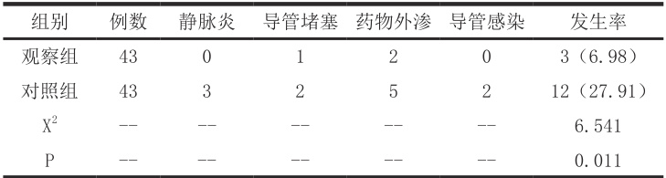 1.2.2 观察组:采取静疗小组结合无缝隙个案护理:(1)构建静疗小组:选取肿瘤科副主任医师、主治医师、主管护师以及临床经验丰富的护理人员构建护理小组,小组成员均展开相关理论培训,具体培训内容涉及PICC 置管适应证、禁忌证、PICC 置管步骤、操作技巧以及相关注意事项,结合实际案例帮助小组成员全面掌握相关知识。(2)无缝隙护理: ① PICC置管流程优化:结合既往肿瘤科实际情况,优化 PICC 置管流程,确保小组成员均可明确其工作内容,完善现阶段工作排班制度,交接班时对于患者情况详细说明,做好护理记录,定期抽查。 ② 置管前:在PICC 置管前,小组成员对 PICC 置管优势、配合要点以及潜在并发症详细讲解,具体讲解形式包含口头讲解、视频播放等,促使患者对于正常置管操作流程初步了解,对于患者存在的问题耐心解答。综合评估患者血管情况,选择与导管相适合的血管置入,选择化疗前 2h 置入导管,尽可能降低化疗药物对于静脉所构成的刺激性作用。 ③ 置管中:在置管期间由护理人员说明护理期间积极配合的重要性,观察患者情绪变化,对于出现紧张、不安、恐惧等不良心理状态的患者采取心理暗示、指导深呼吸等措施保持心态平和,积极配合操作。 ④ 置管后:置入 P I C C 导管以后采取维护措施,在护理操作期间说明具体意义,针对潜在并发症采取相应的预防以及处理措施。例如,针对容易出汗的患者,在护理操作期间尽可能使用无菌纱布,以便于爆炸后具备一定的透气性,以免因潮湿出现感染现象;针对表现为剧烈呕吐以及导管回血的患者,采取正压接头,在化疗结束以后应用脉冲式冲管,并应用肝素稀释液封管处理;长期卧床休息以及表现为凝血功能障碍者主动反馈于医生,采取抗凝治疗措施。置管完成后