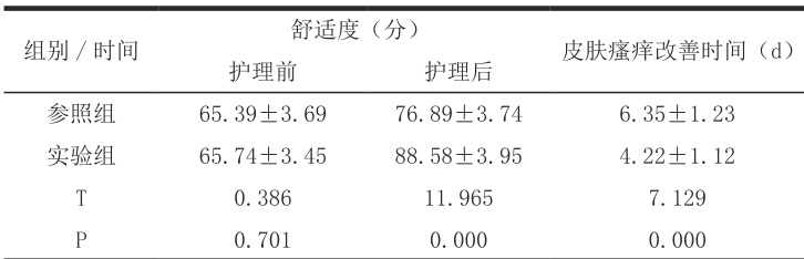 护理前舒适度组间相似 ;护理后实验组数据高,且皮肤瘙痒改善时间更短P<0.05,见表 1。