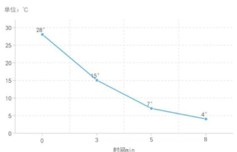 选用一台27L可折叠便携半导体冰箱样机,在室温28℃环境中测试制冷效果。实验显示,箱体八分钟内从28℃降至 4∘C ,随后每分钟降1℃,降至 0% 后稳定维持。与小型传统冰箱相比,该产品制冷更快,且功率低、无污染气体。