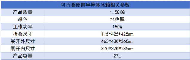 4.2 可折叠半导体冰箱的相关参数以下是关于可折叠便携半导体冰箱的相关参数:
