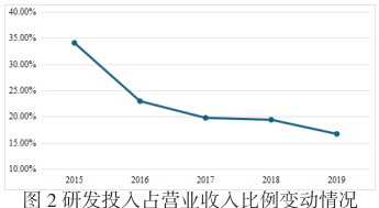 研发投入金额是绝对指标,因此仅靠研发投入金额的变动而不考虑企业资金总量的情况下,评价企业的研发投入能力不够合理,所以本文引入了研发投入占营业收入比例这一相对指标。如图 2 所示,S 企业的研发投入占比呈现逐年下降态势,到 2019 年接近“腰斩”。研发投入占比这一指标体现了企业研发投资的强度,结合研发投入金额的减少,初步表明业绩对赌可能使得企业对于研发投入的不重视,对于创新能力的损害。另外作为技术驱动型公司,研发人员应是核心竞争力,但 S 企业在业绩对赌期内的研发人员变动并不稳定,特别需要关注的是第二年人数急剧减少,说明其并没有通过有效的激励和保护加强核心技术人员的稳定性,可能并不重视创新能力。