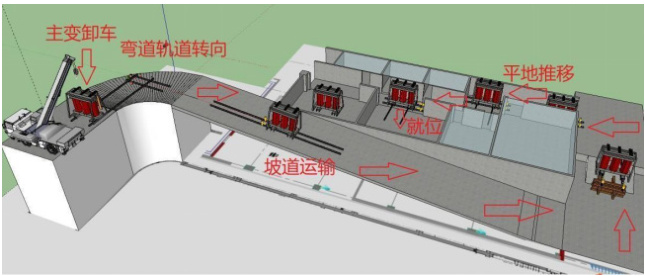 2. 根据狭窄的走廊环境,使用截短的定制短轨道,以方便变压器多次平移、转向运输。
