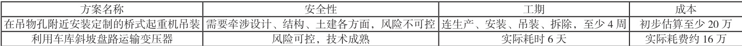 最后对传统方案“在吊物孔附近安装定制的桥式起重机吊装”与新方案“利用车库斜坡盘路运输变压器”进行对比,汇总各方面效益对比表如下: