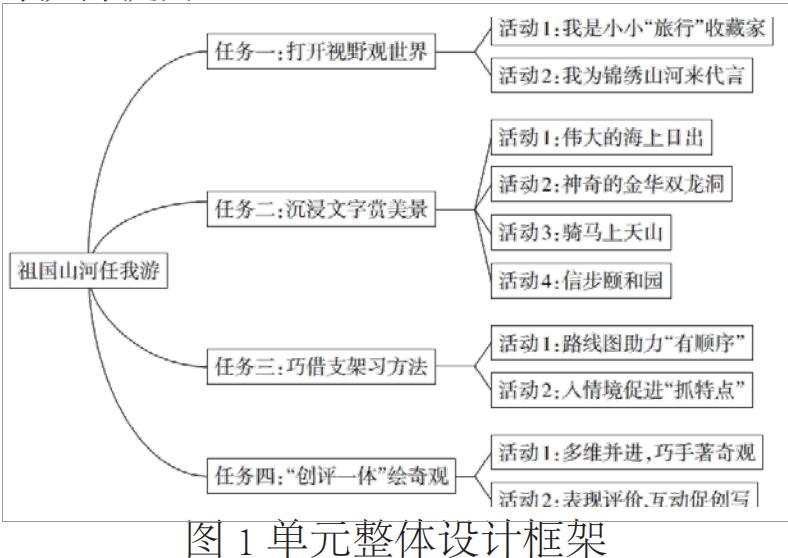在小学语文阅读教学中,教师需根据文本特点和学情分析,搭建适切的阅读支架。对于低年级学生,可采用“图片 + 关键词”视觉支架,帮助学生理解叙事类文本的情节发展;中高年级则可运用 " 问题链 " 思维支架,通过“是什么、为什么、怎么样”的递进式提问,引导学生深入分析说明文或议论文。以统编教材四年级下册第五单元围绕”妙笔写美景,巧手著奇观 " 主题为例,教师应精选了《海上日出》《记金华的双龙洞》等经典写景文章。为深化学习效果,教师可创设 " 我是小导游" 主题情境,通过三个递进式学习环节展开教学,具体思路见图 1。首先引导学生品读文本,借助思维导图梳理景物描写方法;其次通过对比阅读,探究不同文章的写作特色;最后开展“最美风景推荐官”实践活动,让学生运用所学完成创意写作。这种教学设计紧扣单元目标,将阅读赏析与写作训练有机结合,通过搭建可视化学习工具,帮助学生掌握景物描写技巧,实现从阅读理解到创意表达的能力跃升。分层支架的搭建要遵循 " 先整体后局部、先内容后方法 " 的原则,确保每个学生都能在最近发展区内获得提升.