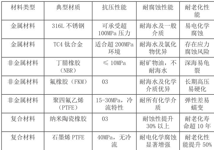 密封材料性能直接决定密封系统可靠性,深水环境要求材料具备优异抗压、耐腐蚀及耐老化性能。当前常用材料分为金属与非金属两类:不锈钢、钛合金等金属材料强度高,可承受深海高压,但动态密封中易因摩擦磨损;橡胶、聚四氟乙烯等非金属材料弹性好,却存在长期高压下老化变形问题。为此,纳米复合等新型材料研发成为热点,其力学与耐腐蚀性能较传统材料显著提升。常用深水密封材料性能对比见表2-1。
