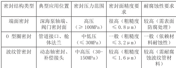 密封结构设计是密封效果的核心,深水环境需考虑高压变形、接触应力分布及动态密封性等因素。常见结构包括端面密封、O 型圈密封和波纹管密封:端面密封精度高但对加工要求严苛;O 型圈结构简单易安装,却存在高压挤出风险;波纹管密封补偿能力强,能适应位移但成本较高。实际应用中需依据工况与密封需求选型并优化设计。常用密封结构性能对比见表2-2。