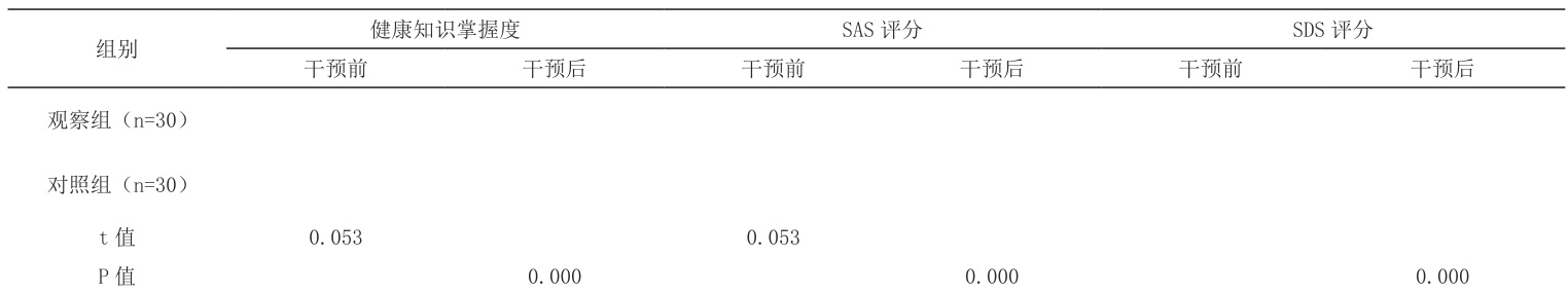 干预后观察组的健康知识掌握度评分较高,SAS评分和 SDS评分均较低, P< 0 . 0 5 ,如表1所示。