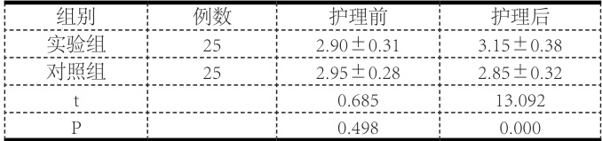 实验组则实施中西医结合护理方案,将中医非药物干预与西医循证护理相融合以提高护理综合效能。 ① 穴位按摩:在护士指导下,患者取坐位或卧位,选取肺俞、定喘、足三里等穴位,以拇指指腹顺时针、适度力度进行按压,每次持续 15~20min ,每日 2 次。操作前评估局部皮肤状况,防止损伤;按摩过程中配合患者呼吸节律,发挥疏通经络、缓解气道痉挛的作用,并全程监护以保障安全。 ② 呼吸功能训练:教授并监督患者进行缩唇呼吸与腹式呼吸,要求吸气时腹部隆起,呼气时缩唇缓慢吐气,每次训练 10~15min ,每日 3 次;根据个体肺功能水平调整训练强度,实时监测血氧饱和度,并指导正确使用支气管扩张剂,强化药物依从性管理。 ③ 结合中医理念的健康教育:在讲解慢性支气管炎知识时融入中医养生原则,建议饮食宜温热、易消化,避免生冷辛辣;强调规律作息及情志调摄;定期开展小组交流,分享防寒保暖策略,适度推广太极拳锻炼,同时每周提供一次面对面指导,建立个性化康复记录以跟踪康复过程。