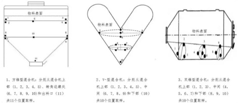 在混合设备中至少选取 10 个取样点,每个取样点至少取 3 份混合样品。单份样品取样量通常应在 1-3 倍单位剂量范围内,样品应全量用于混合均匀度检测。对于常见的滚筒式混合设备(如方锥型混合机、V-型混合机、双锥型混合机),取样点应至少分布在混合物料的上、中、下三层及卸料区域,见图1。
