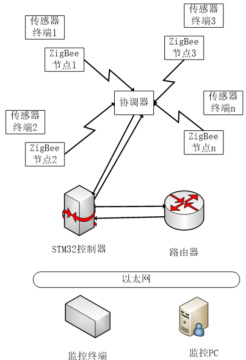 在本研究中,数据监测接收端的硬件架构主要由 ZigBee 协调器与基于 STM32 的嵌入式以太网控制服务器构成。ZigBee 协调器的核心组件为 CC2530 芯片,而嵌入式以太网控制服务器的硬件设计则选用了基于Cortex-M3 内核的处理器作为主控单元,并集成了 ENC28J60 以太网芯片以实现网络通信功能。