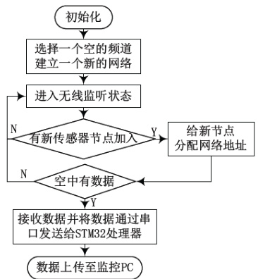 本研究之核心功能在于实现对偏远地区物理参数(包括但不限于压力、温度、位移等)的实时监测与数据采集。通过 ZigBee 技术构建的物联网传感网络,将采集到的数据从各个节点设备传输至嵌入式服务器的协调器。协调器在完成初始化流程、频道选择以及网络建立后,随即转入无线监听模式。在监测到新的传感器节点请求接入网络时,协调器将负责为该节点分配唯一的网络地址,并接收其数据。随后,数据通过串口传输至 STM32 处理器,并最终通过以太网上传至监控 PC。系统整体工作流程详见图 2。