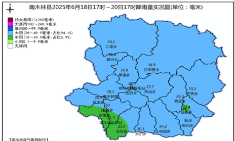 6 月 18 日 15 时至 20 日 17 时累计降水量超过 25 毫米的站点有15 个站点,4 个站点累计降水量在 10~24.9 毫米之间,最大降水量集中在南木林县东南部、北部乡镇,最大降雨量出现在仁堆乡为44.1毫米,最大小时雨强出现在奴玛乡20日 02~03 时为10.4毫米。