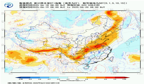 图 2:6 月 18 日 08 时至 20 日 08 时累计降水 EFI 指数(3)卫星云图分析(云顶亮温℃)