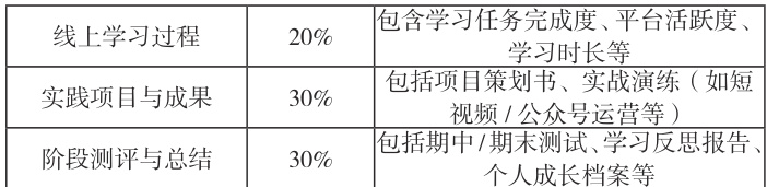 基础认知模块:新媒体概念、发展历程、营销原理;平台应用模块:抖音、小红书、微信公众号、知乎等平台特性与运营策略;内容创意模块:内容定位、短视频剪辑、文案撰写与视觉传播;策划实战模块:整合传播方案设计、线上活动策划、数据分析;成果展示模块:项目路演、线上发布、实战反思。