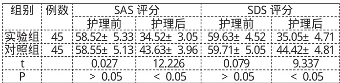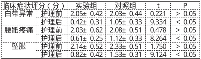 1.2.2 实验组 采取辩证施护的中医护理。根据患者不同证型采取相应护理干预:(1)湿热瘀结证。 ① 情志调节。患者情绪表现为焦虑、抑郁、悲观状态,要积极与患者沟通交流,鼓励患者疏解不良情绪,给予心理安慰。 ② 膳食指导。比如莲子百合猪骨汤、淮山药枸杞骨头汤具有清热去湿的作用,日常要多吃新鲜水果蔬菜,禁食辛辣刺激食物,食物要选择容易消化的种类。 ③ 艾灸。取患者关元穴、子宫穴进行艾灸,不仅可促进血液循环、提高新陈代谢,也能够提高机体免疫力。(2)气滞血瘀证。 ① 情志调节。该证患者情绪表现为烦躁易怒,因此护理人员在沟通时要注意技巧,多以理解性、鼓励性语言为主,给予患者情绪安抚。 ② 膳食指导。气滞血瘀证患者的饮食要以温补为主,比如可选择鱼汤并且加入山药、薏苡仁等,不仅补充蛋白质提高免疫力,还具健脾益气的作用。同时日常可喝益母草红糖水、海带汤等,均具有活血化瘀行气的作用。③ 熏洗。取蛇舌草、蒲公英、三角泡进行煎煮,将煎好的药液放入温水中进行熏洗或坐浴。 ④ 耳穴压豆。气滞血瘀证患者通常伴有肾虚的作用,可进行耳穴压豆。用 75∘ 酒精进行耳朵部位消毒后,用胶带将王不留行籽放置在内生殖器、内分泌、盆腔穴、肾、肝、脾、神门、皮质下等穴位上,每日进行按压刺激,每个穴位按压1~3min/次,每日按压 3~5 次 [1]。(3)寒湿凝滞证。 ① 生活护理。该类患者无明显不良情绪,但由于症状持续时间较长,护理人员要给予患者日常管理,养成良好的生活规律,并且配合合理的运动护理。② 膳食护理。饮食上可多喝姜汤,配合赤小豆、淮山药、薏苡仁、党参等,具有健脾益气的作用。 ③ 针刺。取患者行间穴、阳陵泉穴进行针刺,采用平补平泻法,每次行针间隔5 分钟,留针20 分钟,每日针灸 1 次 [2]。 ④ 保健气功训练。患者日常可做八段锦、太极拳等运动,促进气血运行,每次训练15分钟,每日根据情况可训练1~2次。