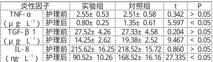 2.3 炎性因子对比 实验组患者护理后炎性因子低于对照组,P<0.05 。见表 3。
