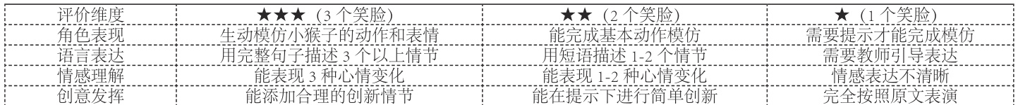 依照元认知理论以及动态评价理论,反思性评价体系的搭建需构建起“评价—反思—改进—再评价”的螺旋上升机制。此策略的创新在于,把单一维度的结果性评价转换为多个维度的成长性评价,借助搭建多种类型的反思支撑推动教师与学生的共同进步。以“小猴子下山”为例,教师可以着重搭建“三阶反思”的评价体系:第一阶段,对故事理解与反思,构建“香蕉标记卡”评价手段,引导学生对故事关键情节的理解状况进行标注,例如在“小猴子掰玉米”这一情节位置,学生能够标记“全然理解”“部分领会”“存有疑惑”三层次,此种直观的自我检测方式,不但简化评价流程,而且能够精准体现出学生的理解水平。第二阶段,表达、应用与反思,在“我演小猴子”的角色扮演环节中,教师可以运用“笑脸评价”的量表(如表 1),重点关注动作模仿(能否表现小猴子的典型动作)、语言表达(是否用简单句子描述情节)、情感表现(能否展现小猴子心情变化)三个维度,针对每个维度都设定了设置三个笑脸等级,学生借助自评及互评的方式来完成反思。第三阶段,生活启示反思,以“我的收获图画”为载体,引导学生用绘画表达从故事中明白的道理。教师提出两个引导性问题:“小猴子最后为什么空着手回家?”“如果是你,会怎么做?”让学生通过图画和简单语句完成反思。