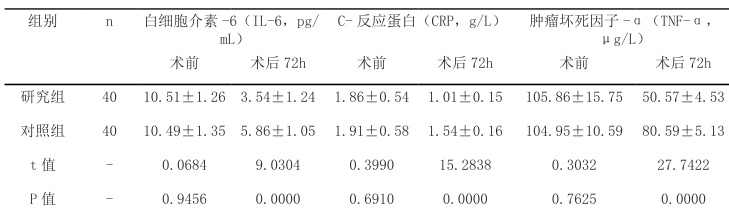 于术前 / 后(72h),记录炎症因子,取 3mL 为血液标本,常规离心处理(3500r/min,半径 10cm,离心5cm,型号:DM-0424 ;北京信钰仪器有限公司)。以全自动血液细胞分析仪(生产厂家:上海名元实业有限公司;品牌:开立;型号:SC-5290 ;注册证号:粤械注准 20182400294)检验 IL-6、CRP、TNF-α 等。