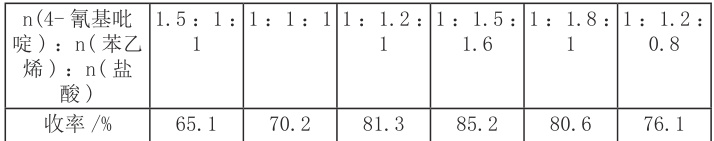 在如前所述的反应条件下,研究原料 4- 氰基吡啶、苯乙烯和盐酸物料摩尔比对产品收率的影响,结果见表 2 :表 2 物料摩尔比的影响