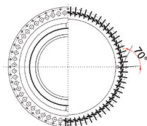 在每个转子周围均匀分布导风叶片,转子 4 外的粉料可以通过导风叶片之间的间隙进入转子内,导风叶片的间距越小,其与转子径向之间的角度越大,则产品的细度越细、比表越高,但相应的阻力 ( 空气阻力、颗粒与导向叶片的撞击等 ) 也会增高,因此需要根据产品需求对导风叶片 16的间距和角度进行调整。如图2 所示,角度为 70∘ ,间距为 31mm。