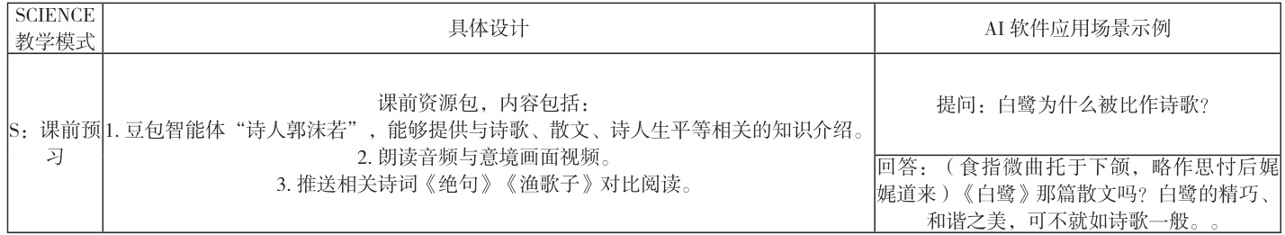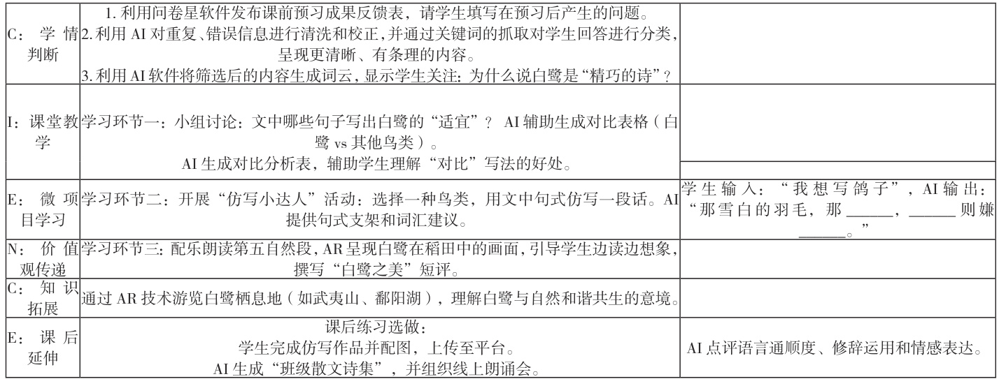 然而,正如美国天文学家卡尔萨根所说,技术需要智慧引导。每一次技术的突破都如普罗米修斯之火,既带来了无限光明,也伴随着失控风险。在师生都叹服于 AIGC(人工智能生成内容)的高效时,也发现各个学科的特性使得它们与新技术的适配度也有所不同。然而,语文教学不仅关乎语言知识的传授,更承载着文化传承、情感熏陶和审美培养的功能。郭沫若的散文诗《白鹭》语言优美、意境深远,教学过程中既要引导学生品味语言、学习写法,也要带领学生走进文本深处,感受作者对自然之美的热爱。如何在使用 AI 技术的同时不失语文课的“语文味”,是当前值得深入探讨的课题。