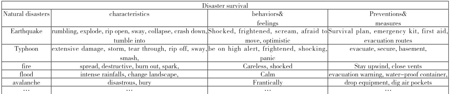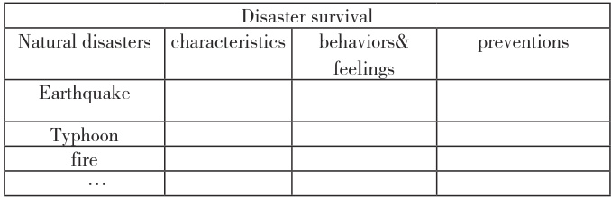 教师根据大单元主题,引导学生对本单元词汇进行主题细化。以选择性必修二第四单元为例:本单元主题群是“自然灾害与防范”。在教学实践中,教师通过课堂活动引导学生发挥创意,可以把主题词汇细化为如表一所示: