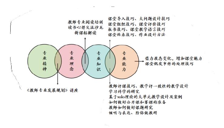 我们在区域层面针对性地设计培训课程,既有相关专业理论,又有跟岗学习、一课多磨、听课评课等形式的实践活动。在培训内容的选择上,与教师们的原有实践找到契合。培训课程在理论性和实践性上都与教师的需求找到“共同域限”,让教师视之“可行”,并容易将其整合、践行到自身的教学行为程式中(如下图)。培训课程选择上既满足大多数老师共同需求,又通过“青蓝结对”的一对一精准培养方式关照到个性需求。